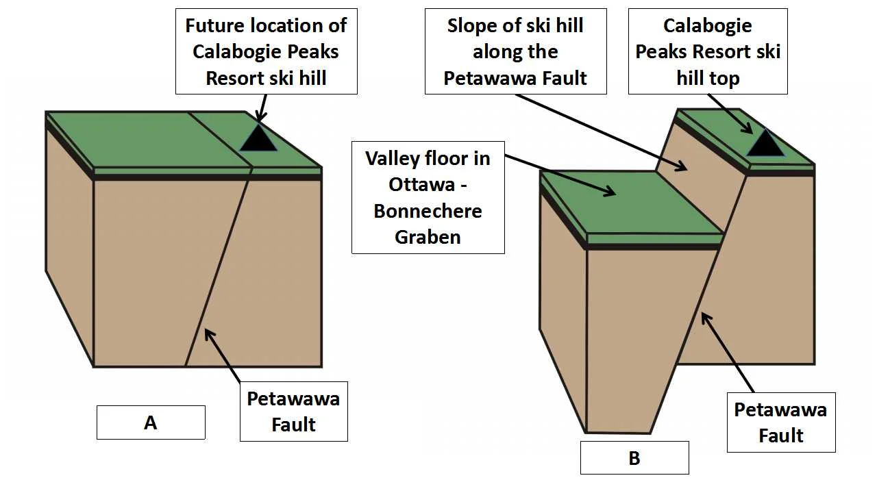 The formation of the Ottawa - Bonnechere Graben is the geological process that created the elevation difference between the rugged, hilly Opeongo Mountains south of the Petawawa Fault, at the top of the ski hill, and the relatively flat rift valley floor located to the north of the fault, at the bottom of the ski hill (Figure 4).